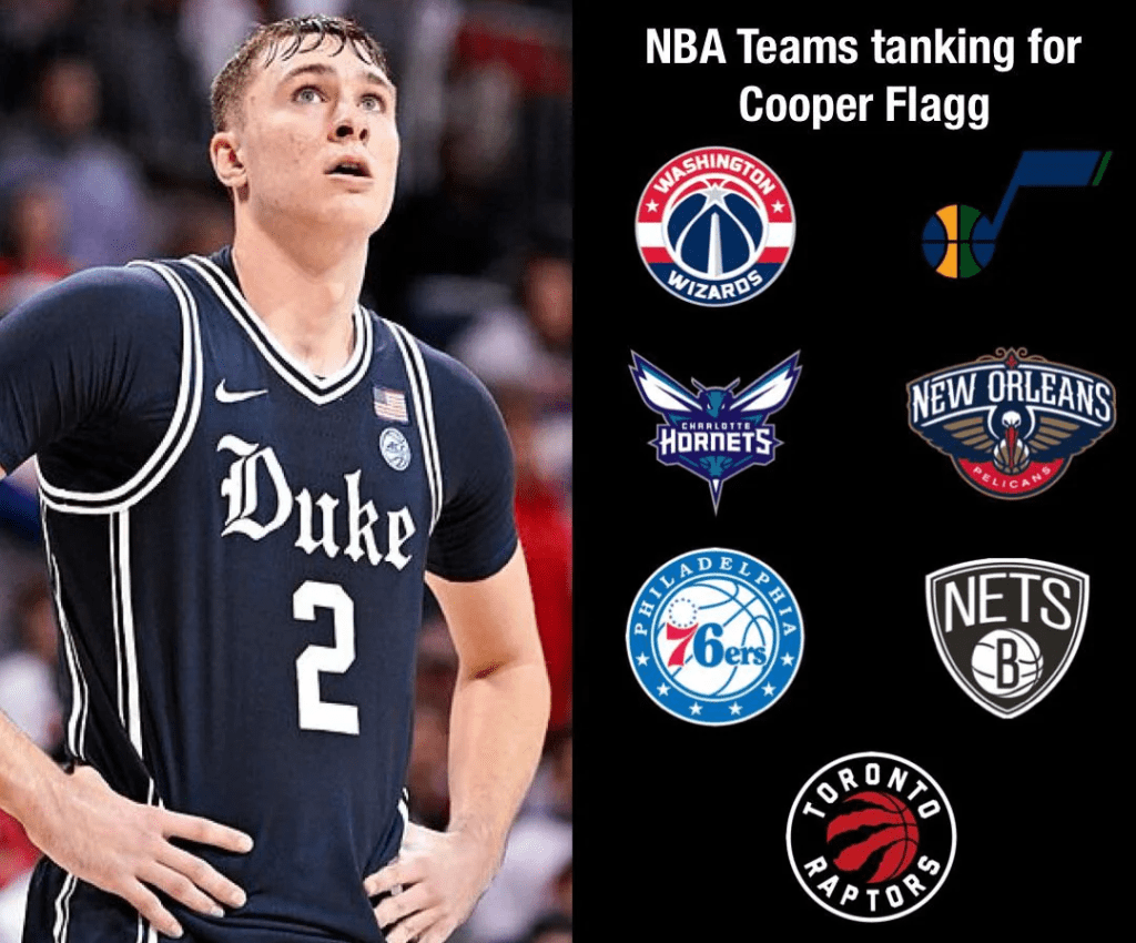 Shows a picture of teams tanking for Cooper Flagg, a prospect with potential (https://www.reddit.com/r/NBATalk/comments/1jaemti/how_should_the_nba_fix_its_tanking_problem_in_the/?utm_source=share&utm_medium=mweb3x&utm_name=post_embed&utm_term=1&utm_content=1)