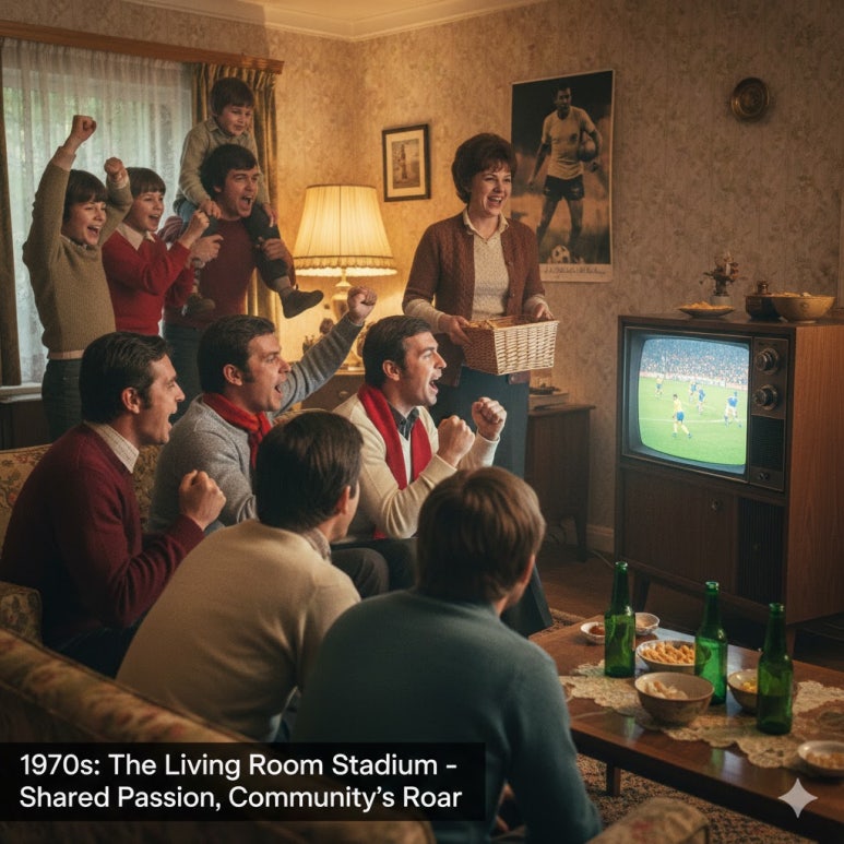 텔레비전이 처음 보급되던 시기, 그것은 개인의 소유물이 아니라 공동체의 것이었다. 가격이 너무 비쌌기 때문이다. 영국 노동자 계층 동네에서는 텔레비전을 가진 이웃집에 동네 사람들이 모여 함께 시청하는 것이 일반적이었다. 이탈리아에서는 동네 바르(bar)가 그 역할을 했다. RAI가 축구 중계를 시작하자 바르에 텔레비전이 놓였고, 경기 시간이 되면 남자들이 카운터 주변에 모여들었다. 이 문화는 오늘날까지도 이탈리아 바르 문화의 일부로 남아 있다. 브라질의 파벨라와 아르헨티나의 노동자 구역에서는 텔레비전을 가진 집이나 가게 앞에 사람들이 모여들었다. 1970년 월드컵 당시 브라질 전역에서 텔레비전을 가진 집의 거실은 동네 사랑방이 되었고, 없는 집 사람들은 가게 쇼윈도 앞에 서서 중계를 지켜봤다. 텔레비전은 처음부터 혼자 보는 매체가 아니라 함께 보는 매체였고, 그 집단적 시청의 경험이 축구를 공동체의 의례로 더욱 단단하게 만들었다.